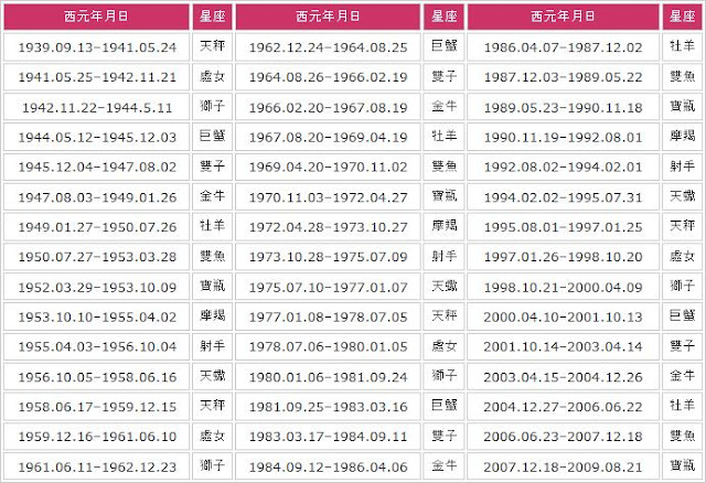 自己星盤上南北交點的位置,在一般的占星軟體都會註明。倘若不知道自己個人星盤者請對照下圖您出生的西元年月日時間,即可迅速找出您北交點所座落的星座。